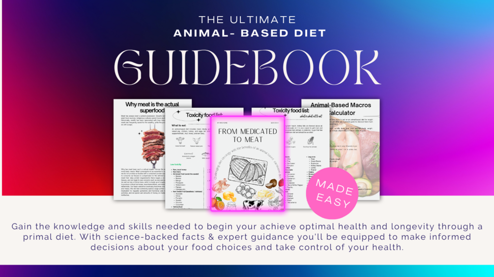 The Medicated to meat e-book on the benefits of an animal-based diet. This contains a toxicity based what and what not to eat to kickstart your new healthly lifestyle!